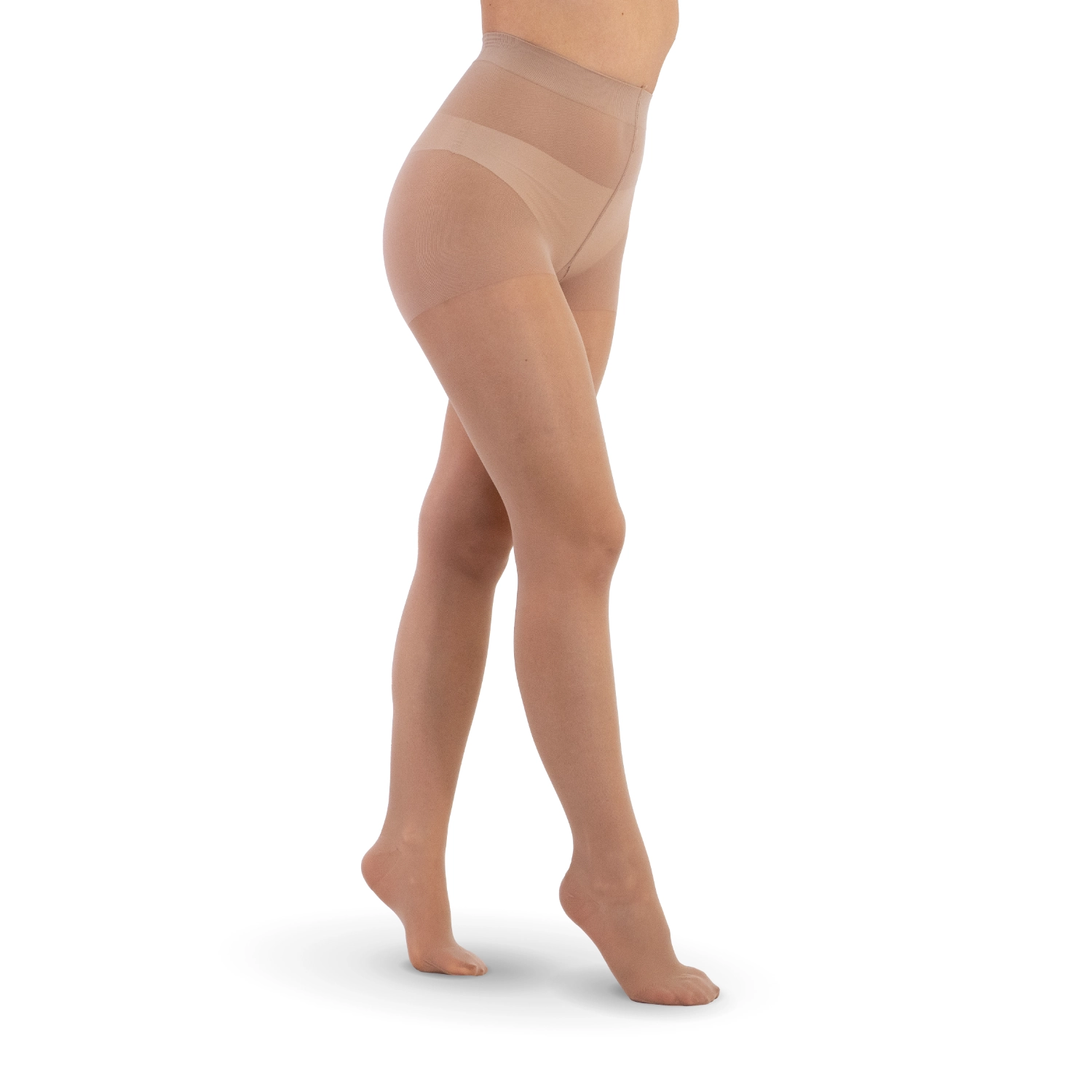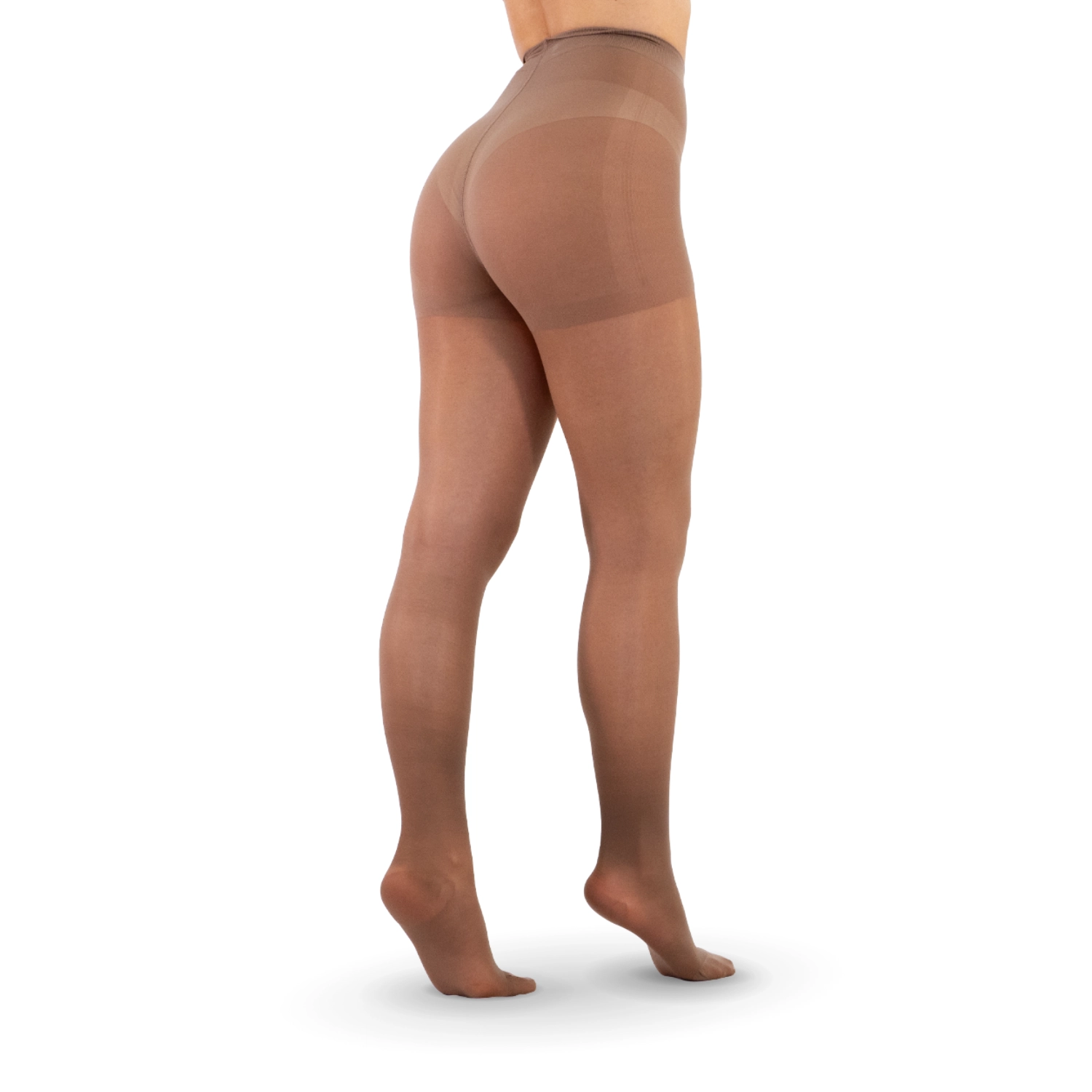 Calza riposante a compressione differenziata in lycra, doppia ricopertura, vero tallone diminuito, mutandina anatomica, con tassellino nelle taglie da 1 a 4 o tassellone per taglia 5.